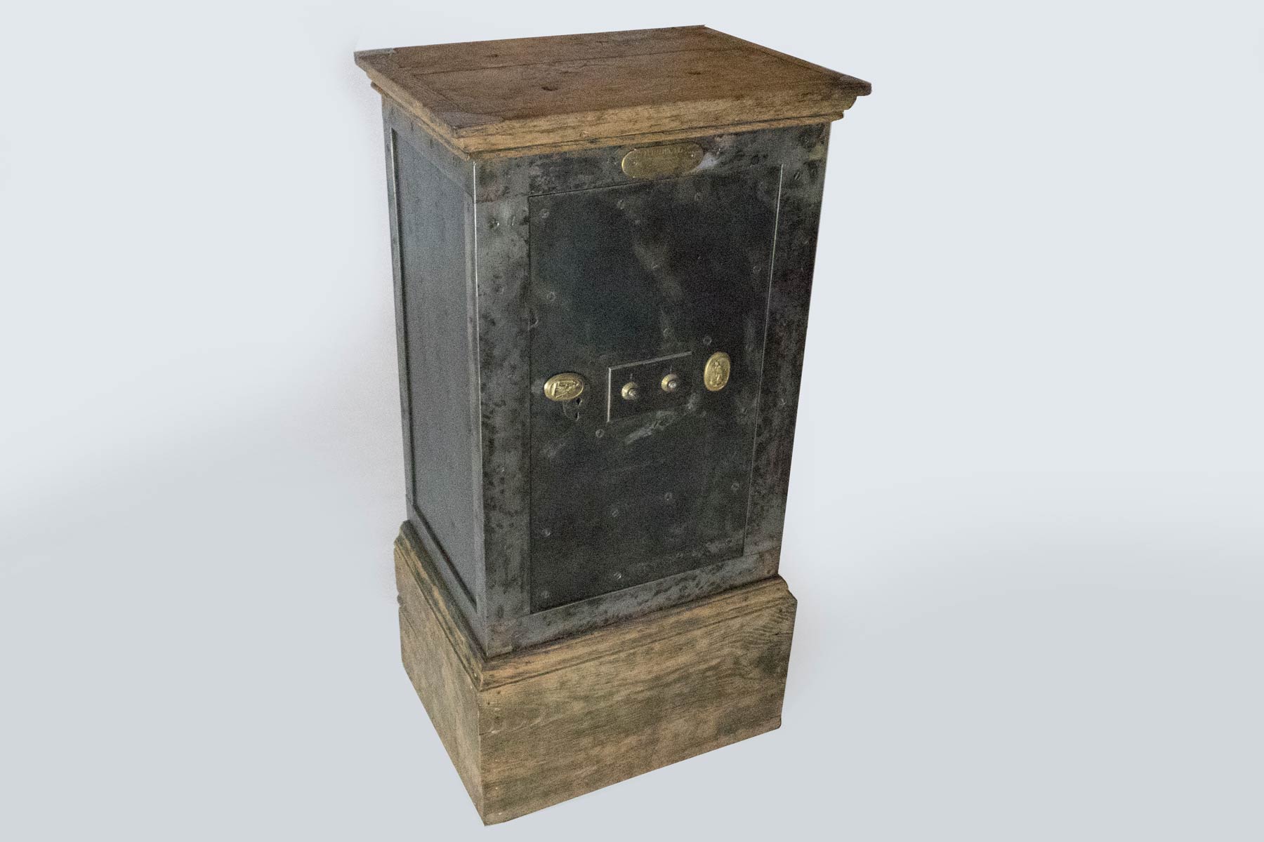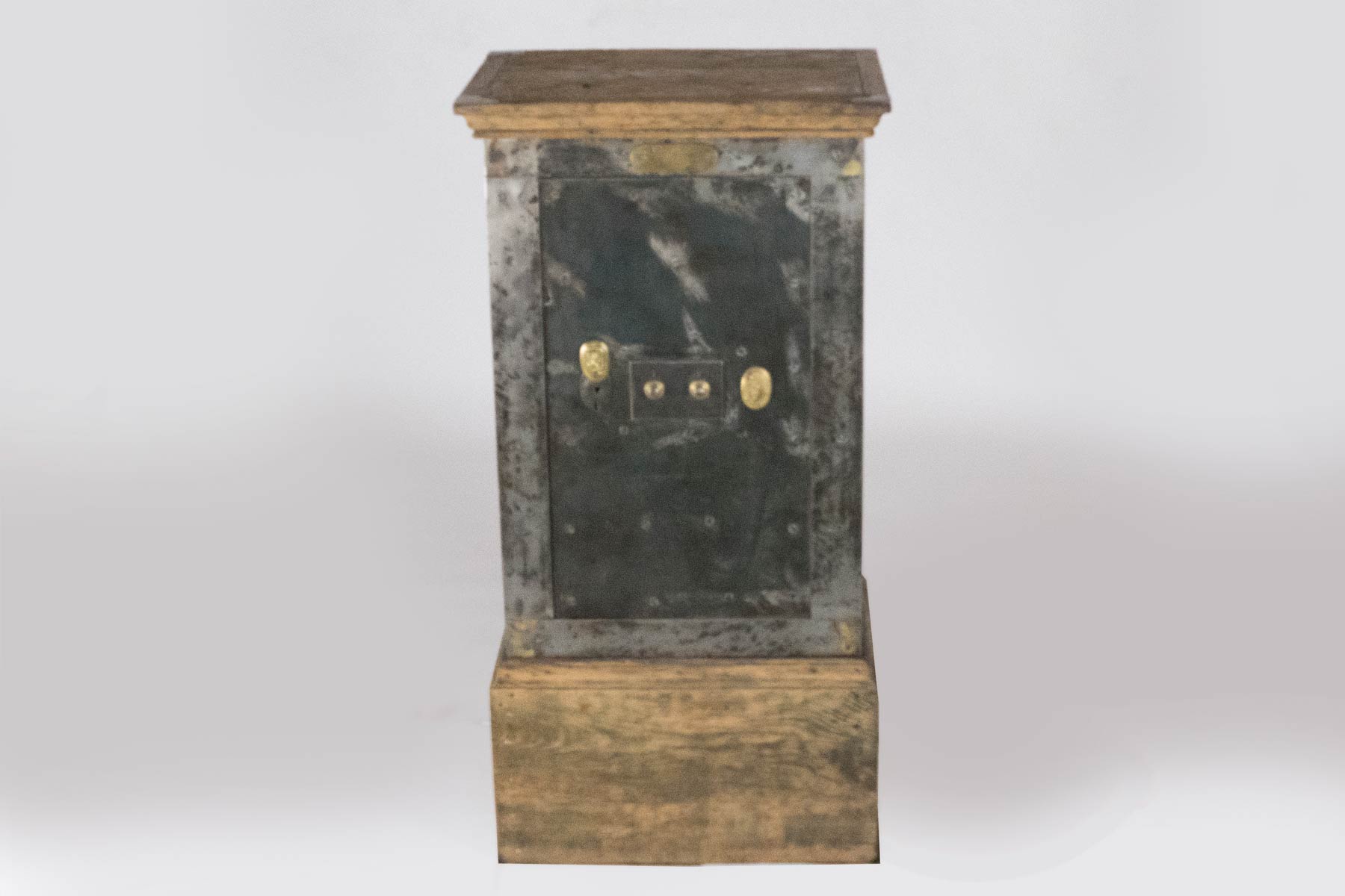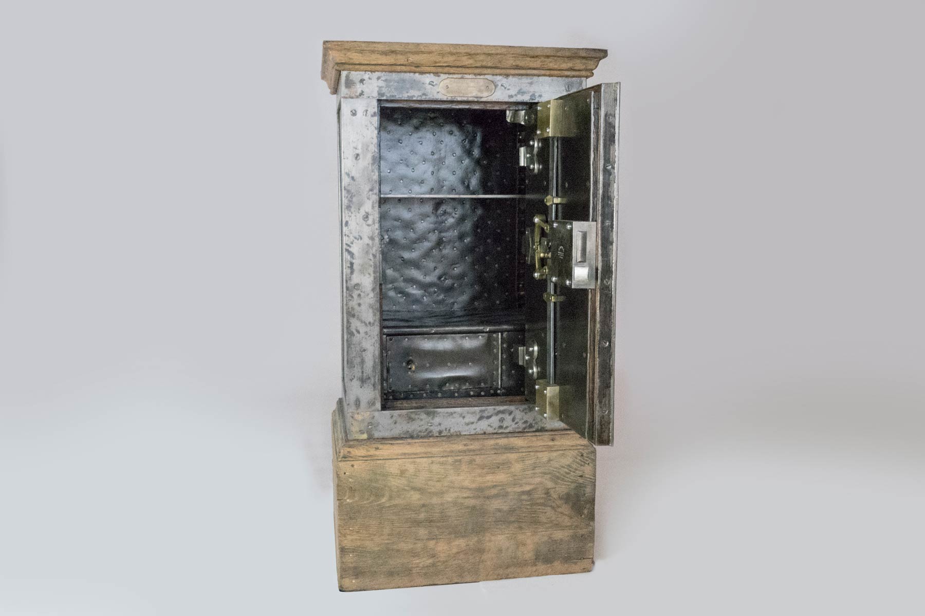 This mid sized steel safe is in perfect working condition. The two tumbler combination lock along with the key system has two beautiful decorative brass elements to hide the key holes. Inside the safe also has a keyed jewelry box and an adjustable shelf. The steel has been stripped down to a gun metal patina and