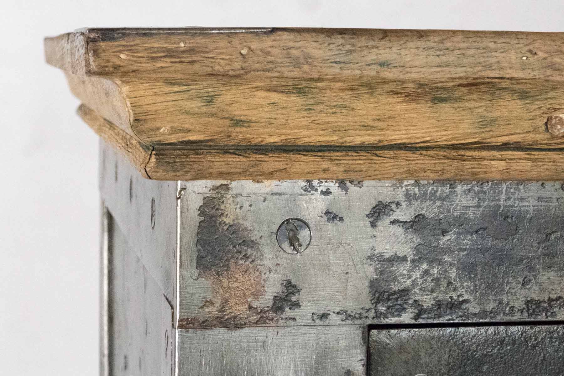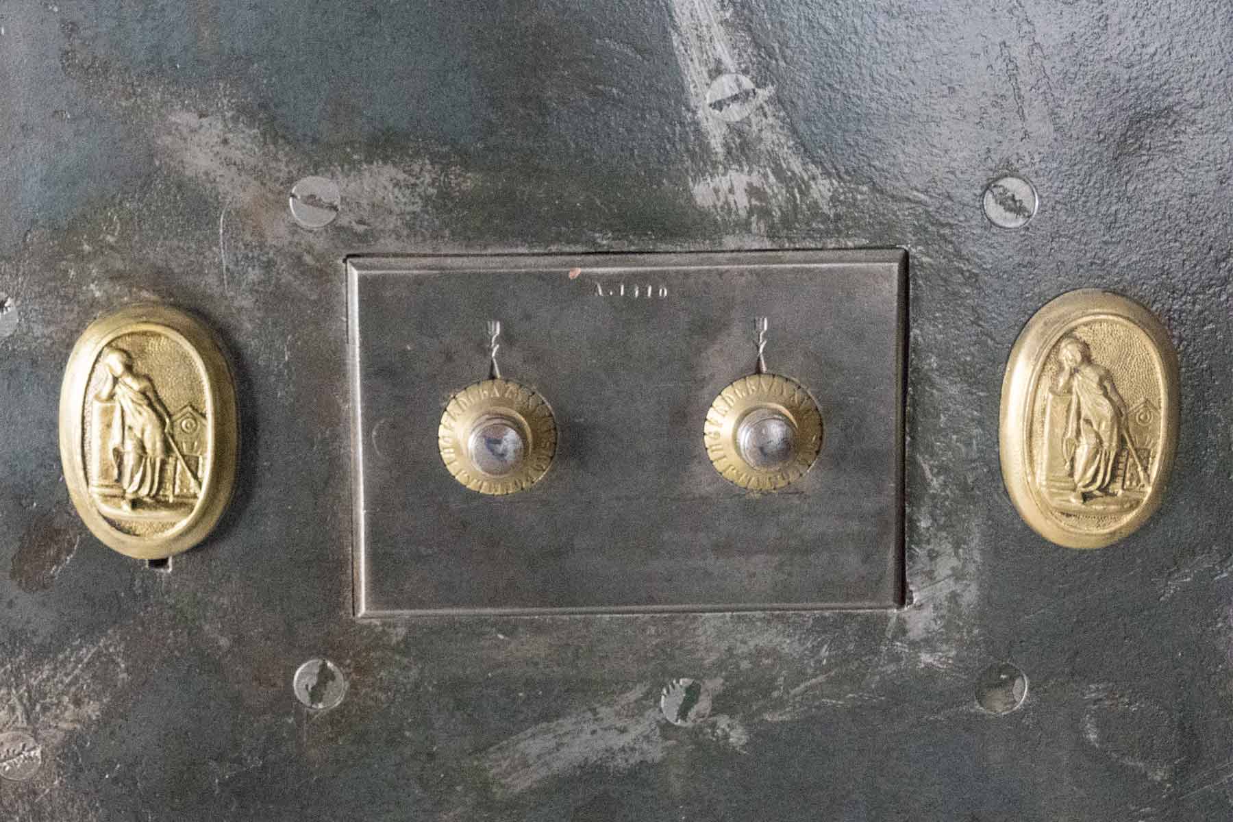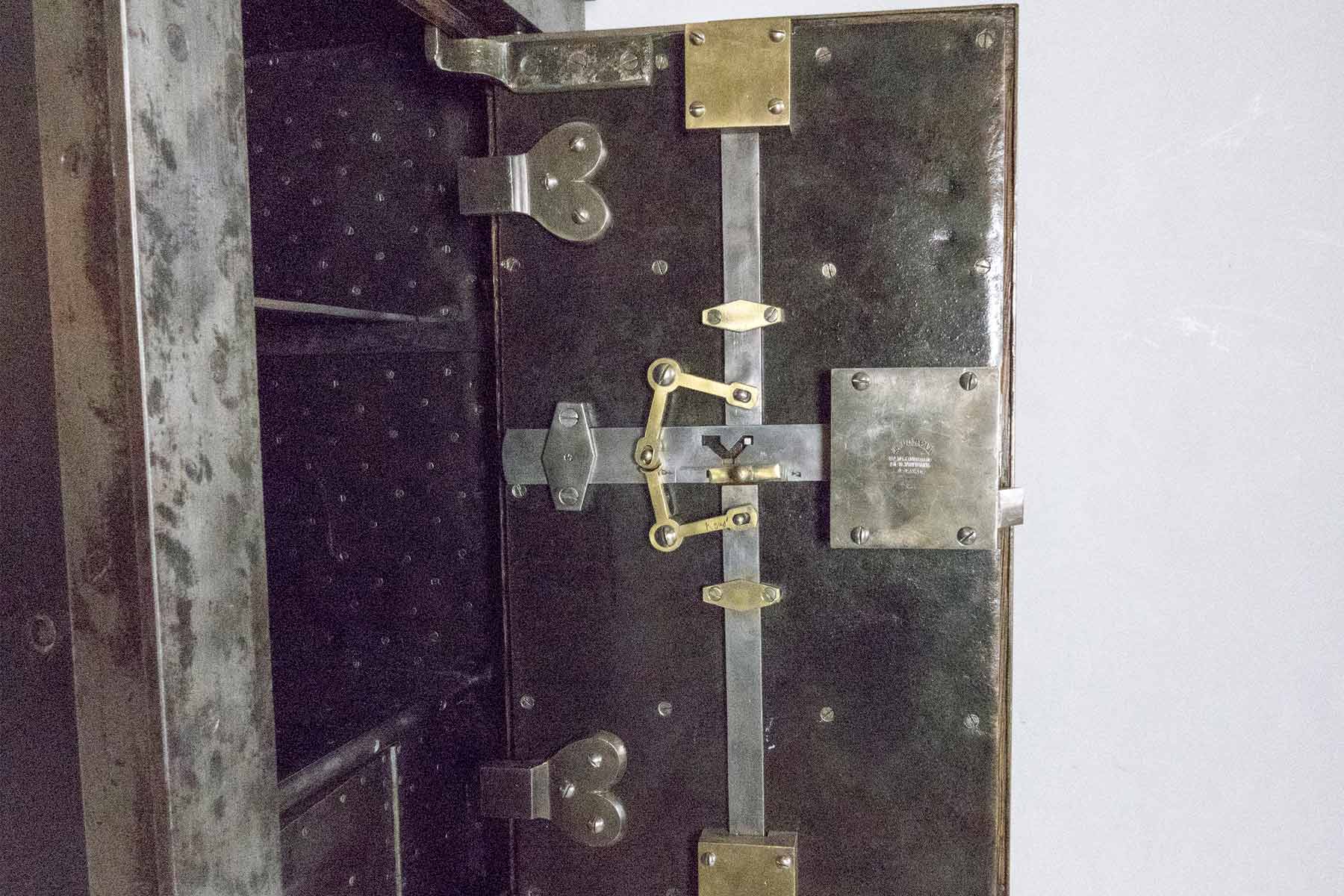 This mid sized steel safe is in perfect working condition. The two tumbler combination lock along with the key system has two beautiful decorative brass elements to hide the key holes. Inside the safe also has a keyed jewelry box and an adjustable shelf. The steel has been stripped down to a gun metal patina and