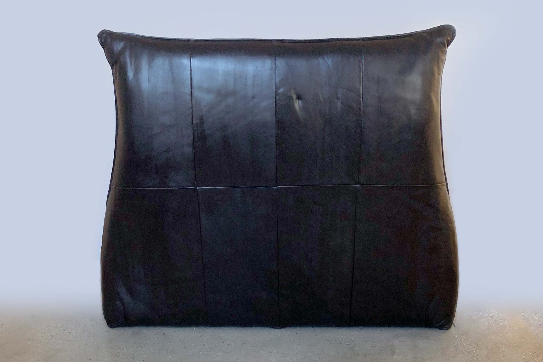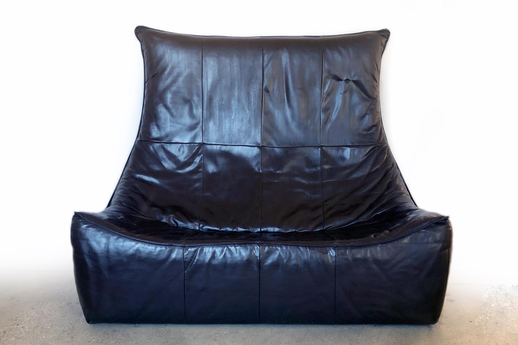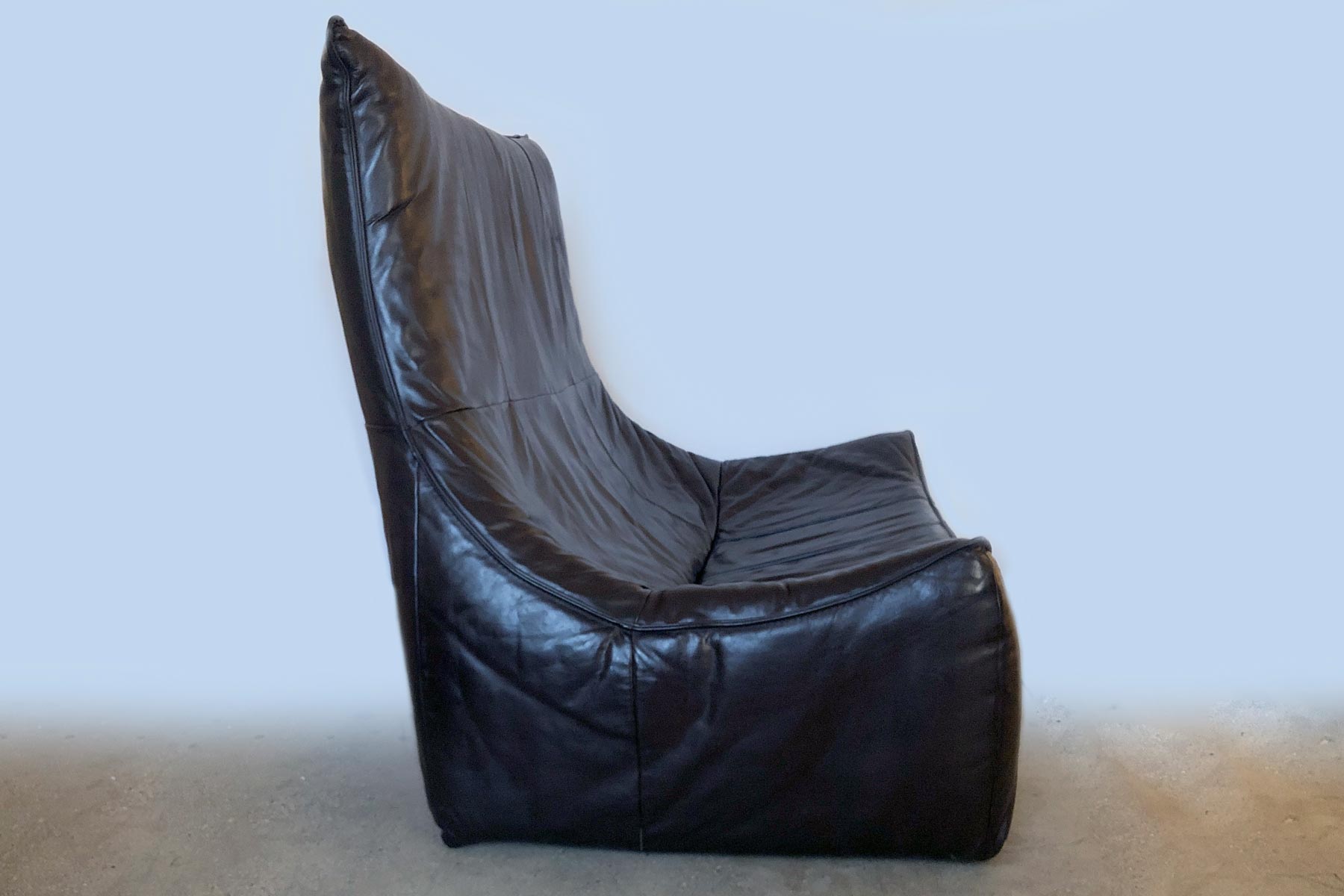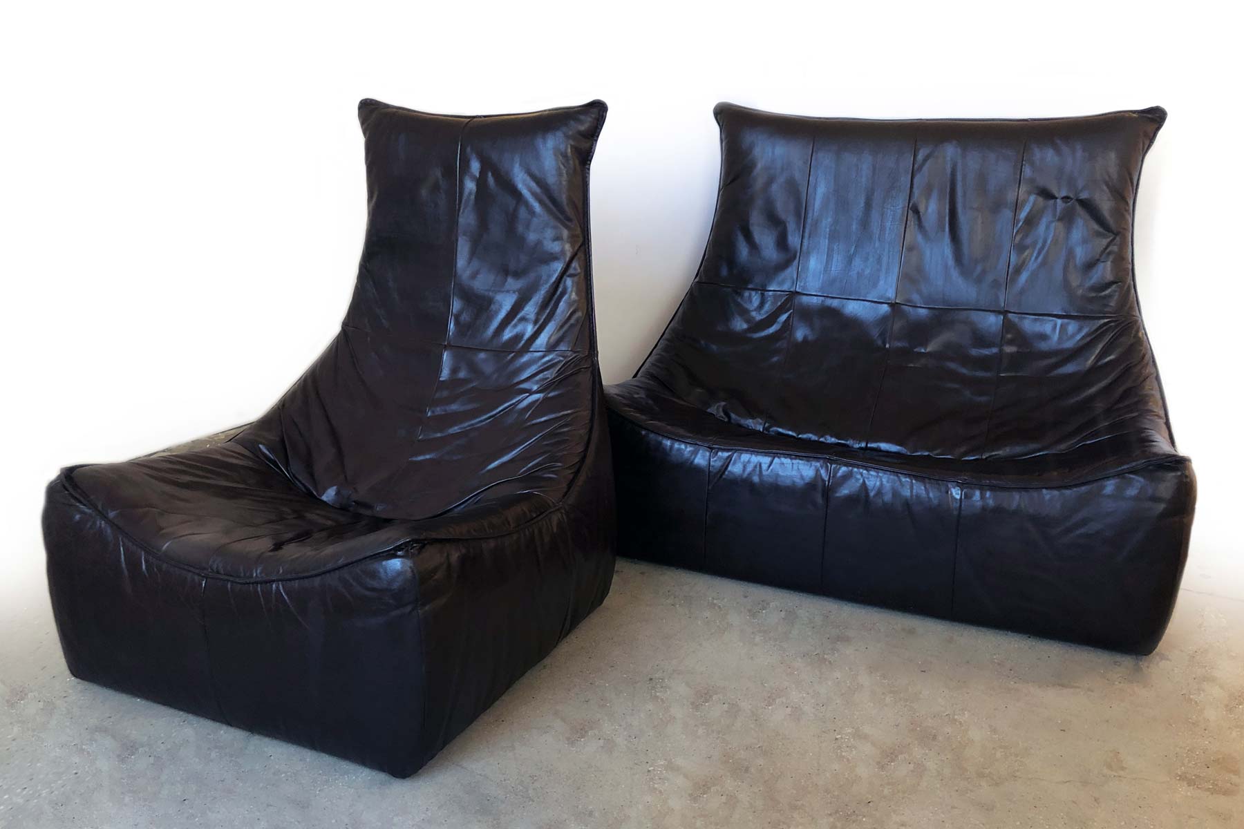 The Rock love seat sofa is upholstered in a dark chocolate brown leather. The leather is in exceptional condition. We are also offering a perfect condition single chair to complete the set.