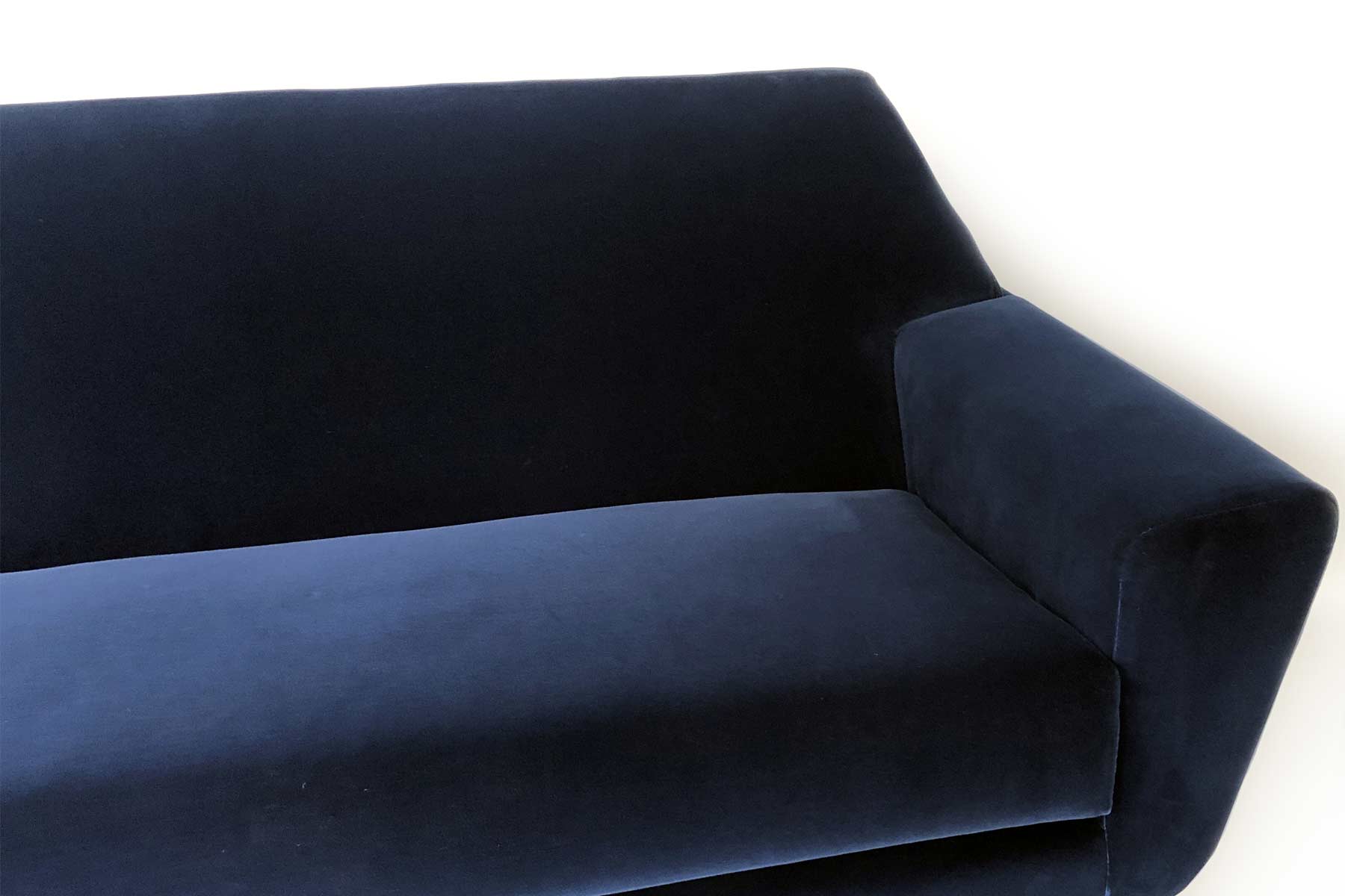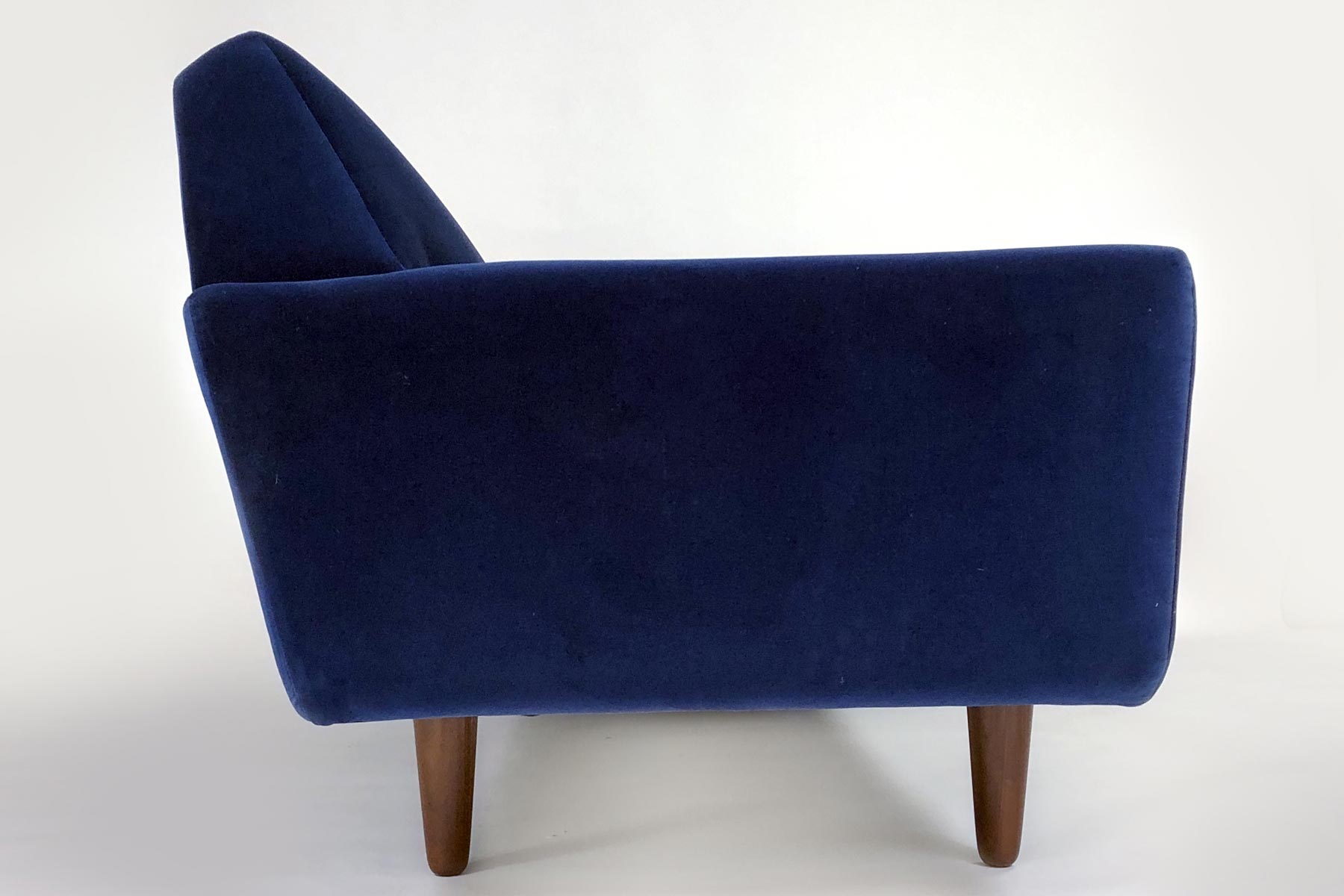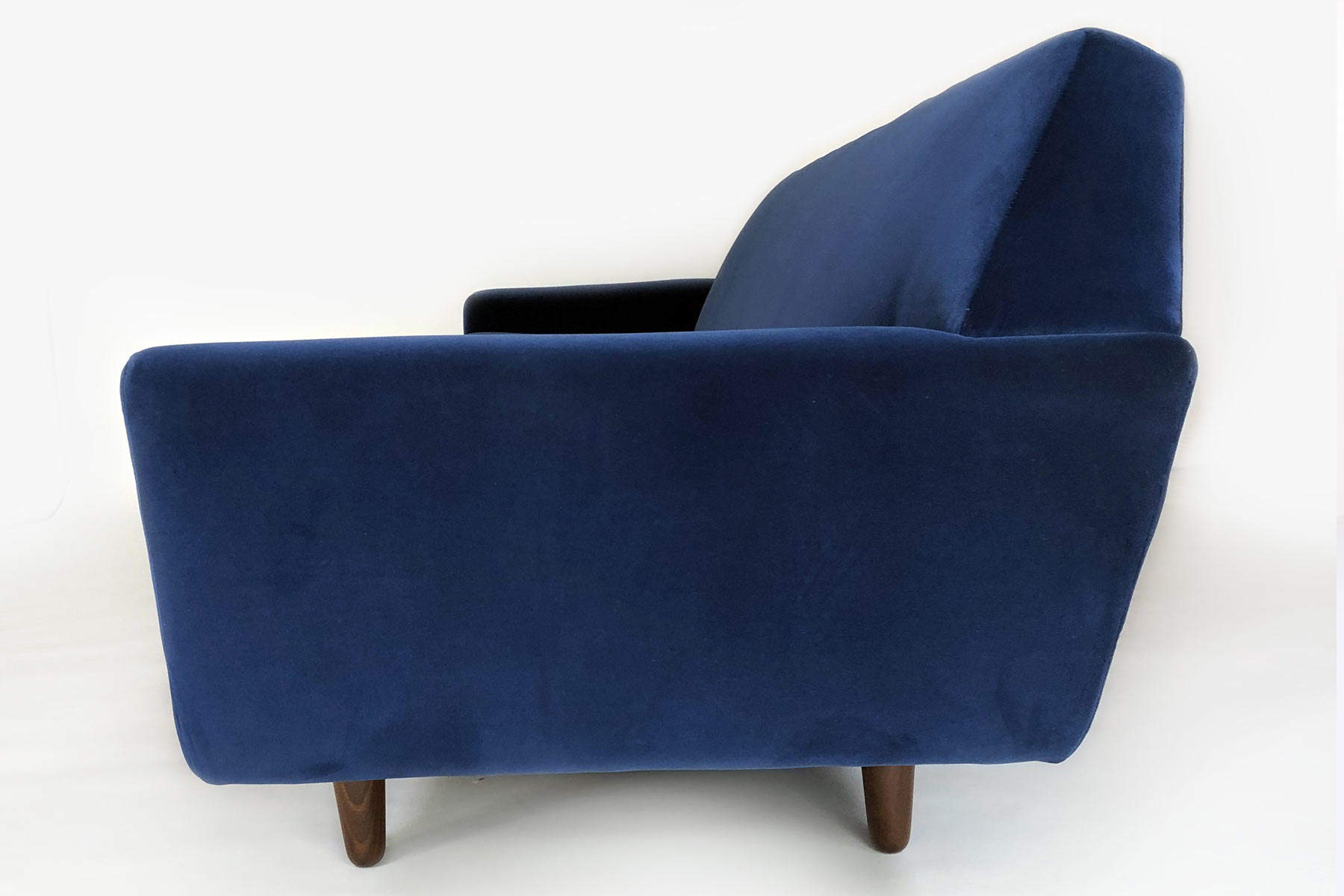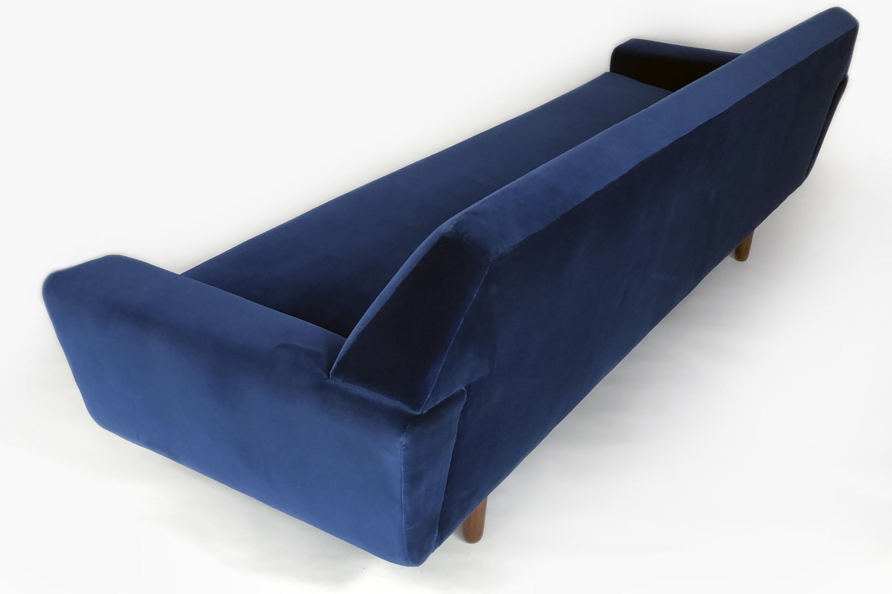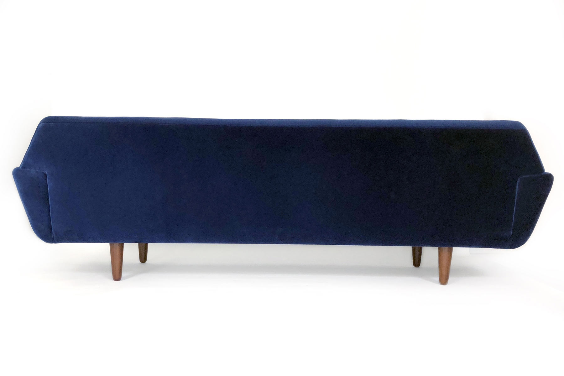 Very sleek Danish mid-century sofa. Refurbished and covered with navy blue cotton velvet upholstery. Four rosewood conic legs.