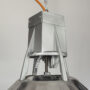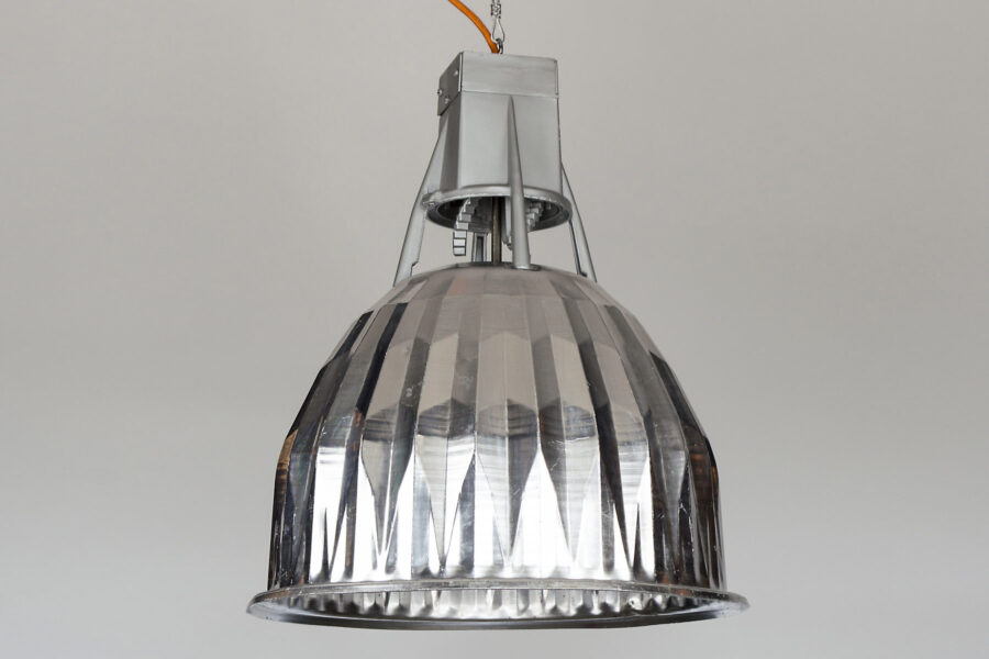 A creative way to light up a workspace in a kitchen or office. They are more decorative than most industrial pendants. The crinkled shape of the bell housing diffuse the light beautifully. The frame has many interesting little details, which catch your eye. The pendants have been suspended on stainless steel cables and wired with a silk covered wire to add a splash of color. Light uses one standard base bulb. Max wattage 300 watts.