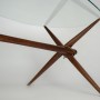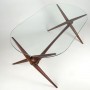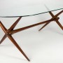 1960’s small low oval coffee table. Walnut frame with brass accents. Glass table top.