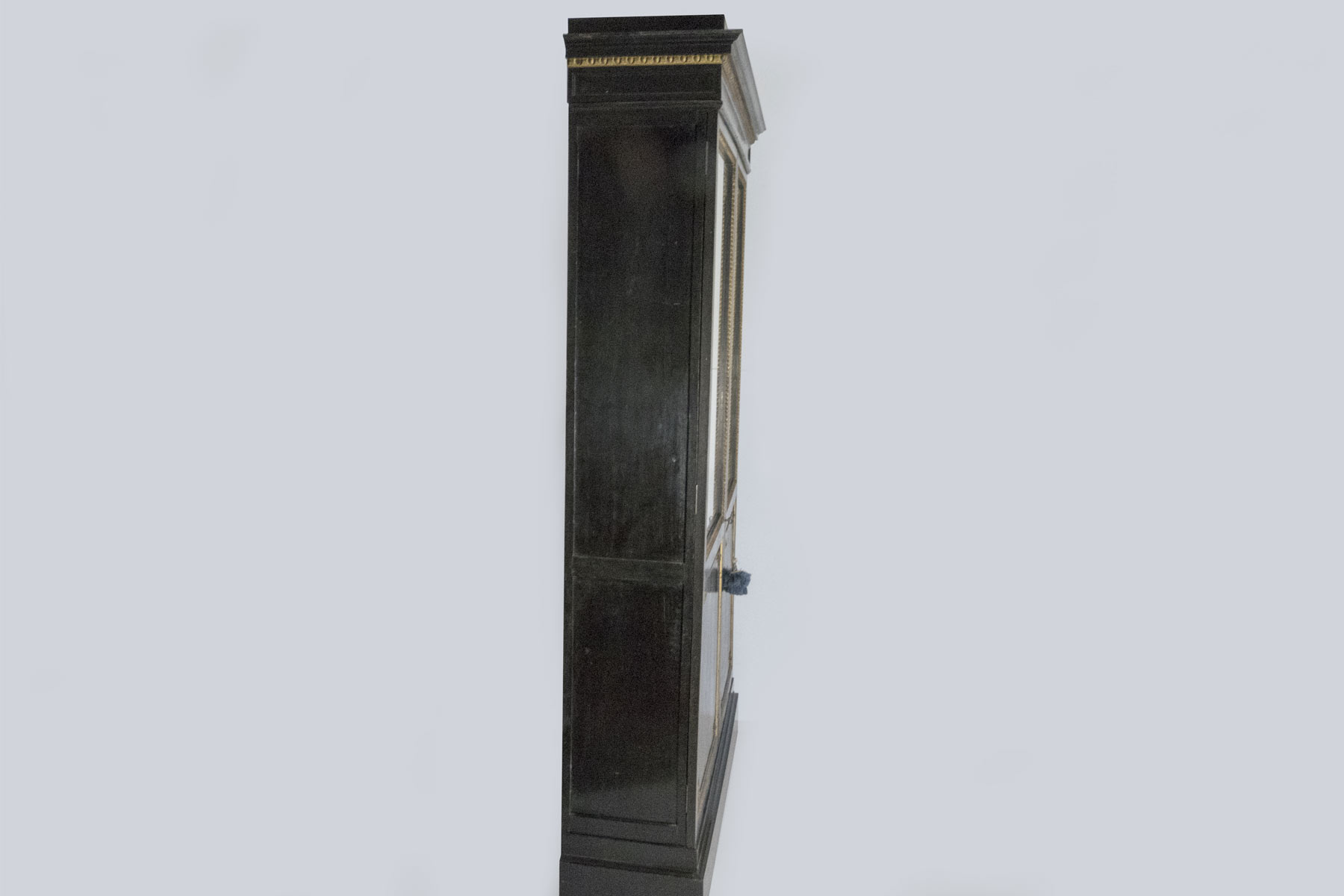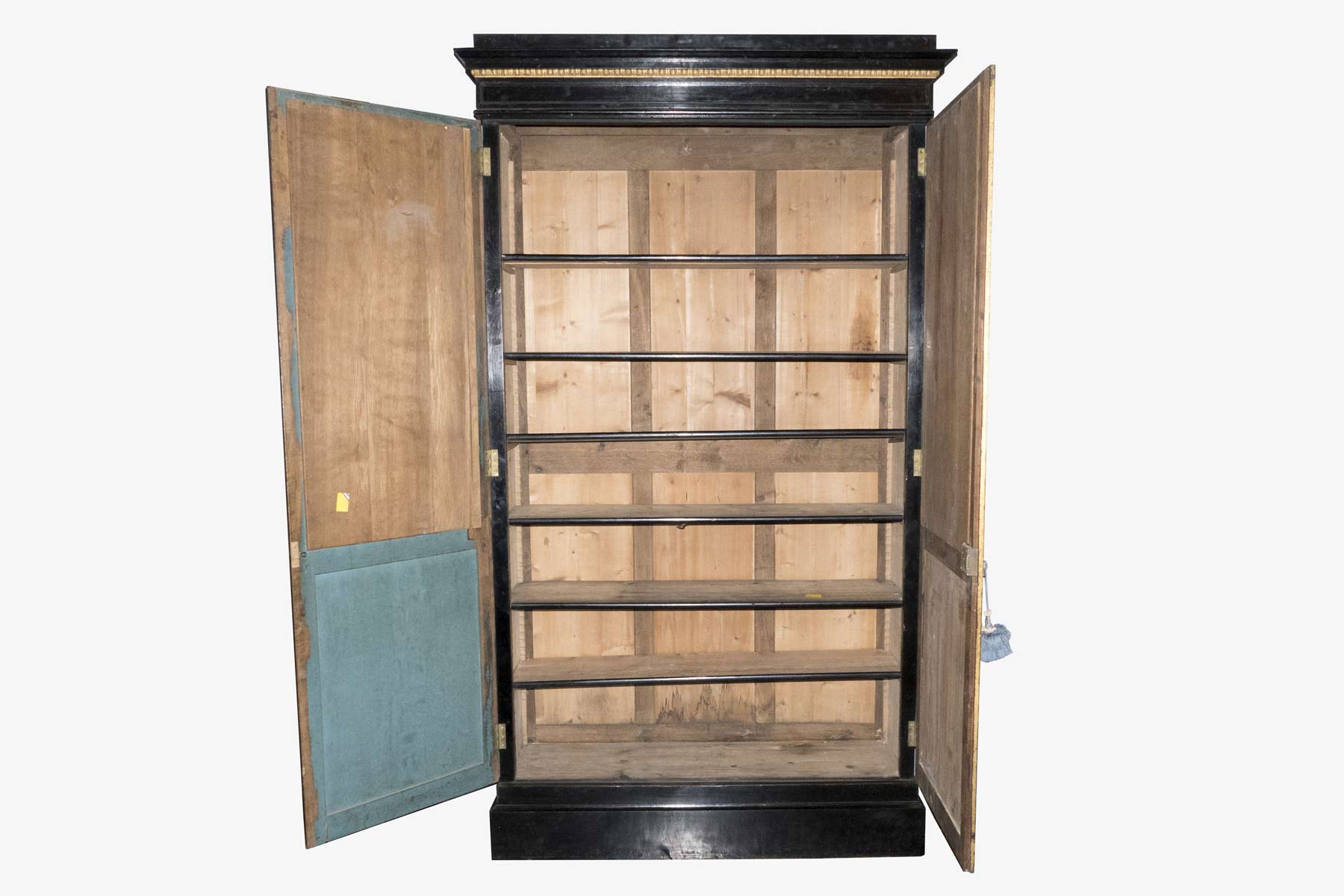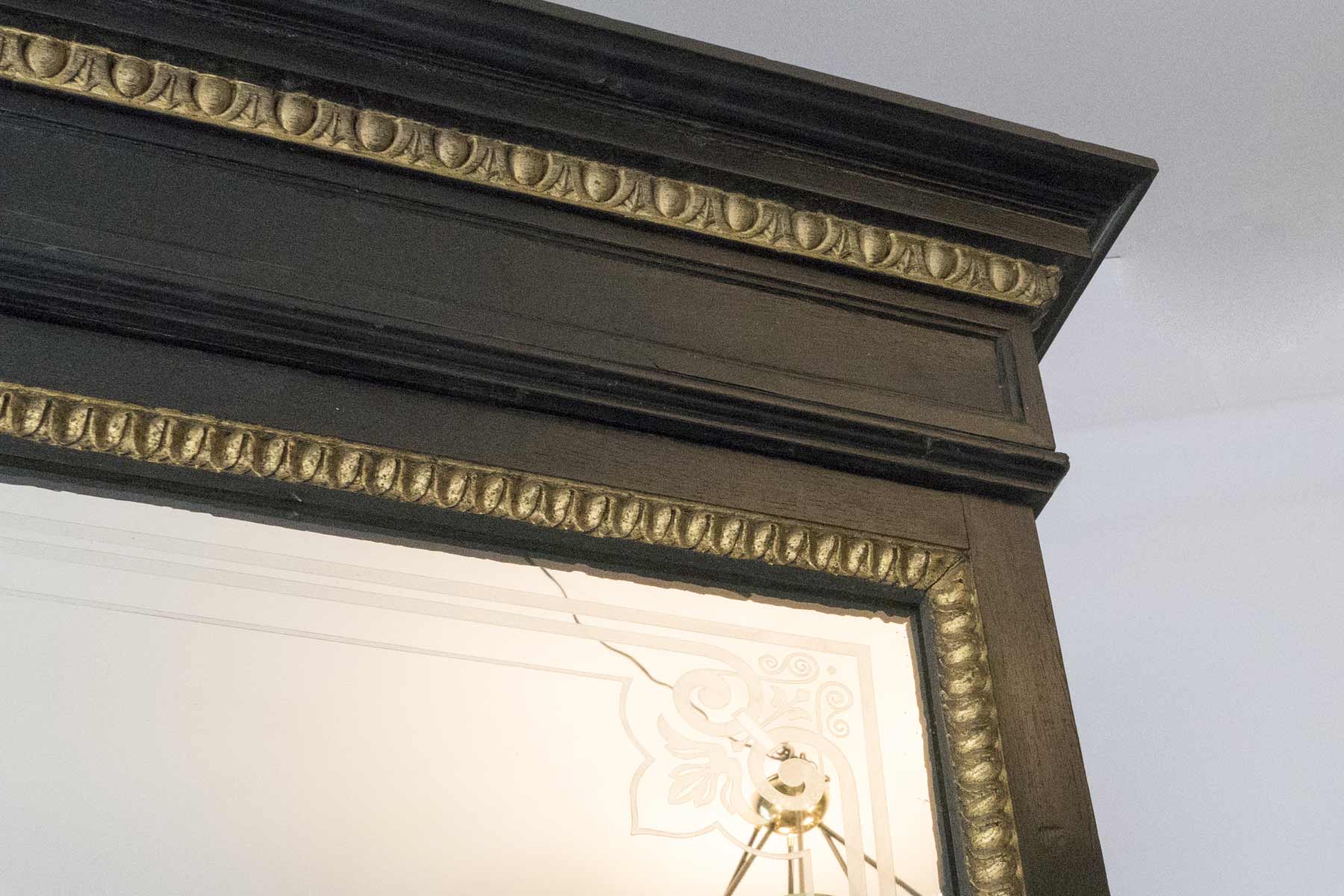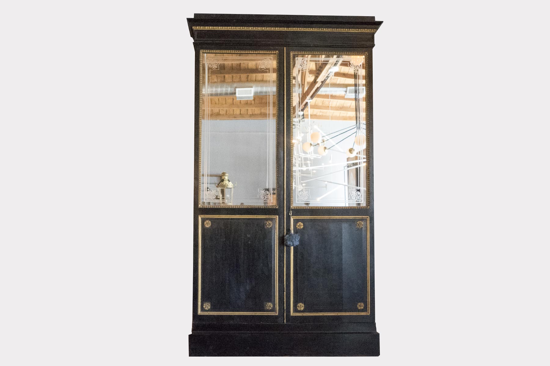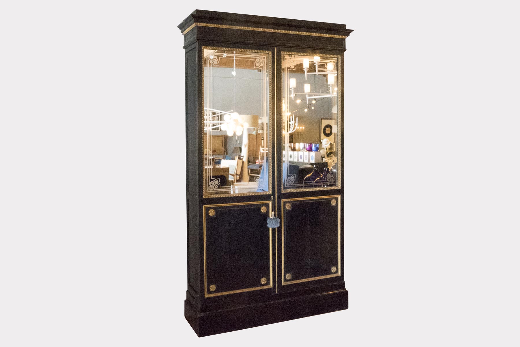 This impressive cabinet has it original etched mirrored doors and gilded carved wood accents. It is in great condition and will create a real statement. The cabinet has an ebony finish of the exterior oak frame.