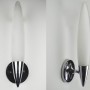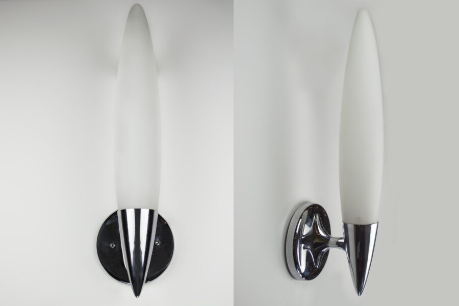 Two wall sconces with chrome finish. The Opaline glass diffusers add to their unique design. The sconces have been rewired. a back plate has been added for simplify installation and meets modern standards. The fixture uses one candelabra base bulb in each light ( 40 watt max. )